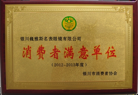 銀川巍雅斯名表眼鏡有限公司 被 銀川消費(fèi)者協(xié)會 評為“(2012-2013年度)消費(fèi)者滿意單位