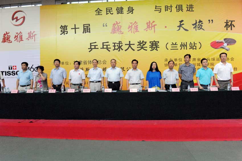 8月15日上午,在蘭州城市學(xué)院培黎校區(qū)體育館,備受社會(huì)各界關(guān)注的體育比賽——第十屆“巍雅斯·天梭”杯乒乓球大獎(jiǎng)賽(蘭州站),在超千名運(yùn)動(dòng)員及體育愛好者的歡呼聲中正式拉開帷幕。此次大獎(jiǎng)賽由甘肅省體育總會(huì)、巍雅斯名表眼鏡有限公司和瑞士天梭表主辦,甘肅省乒乓球協(xié)會(huì)承辦,蘭州城市學(xué)院、甘肅省廣播電影電視總臺(tái)、蘭州晨報(bào)協(xié)辦。應(yīng)邀出席當(dāng)天活動(dòng)的領(lǐng)導(dǎo)及嘉賓有:蘭州軍區(qū)黨委常委、蘭州軍區(qū)聯(lián)勤部部長(zhǎng)、原蘭州軍區(qū)副參謀長(zhǎng)楊旭華、甘肅省廣播電影電視總臺(tái)總臺(tái)長(zhǎng)康堅(jiān)、蘭州城市學(xué)院院長(zhǎng)王汝峰、中國(guó)鐘表商會(huì)副會(huì)長(zhǎng)、甘肅省眼鏡協(xié)會(huì)會(huì)長(zhǎng)、甘肅省乒協(xié)副主席、巍雅斯名表眼鏡有限公司董事長(zhǎng)裴正江、瑞士天梭表中國(guó)區(qū)副總裁王穎、甘肅省司法廳巡視員、甘肅省乒協(xié)副主席張克年、甘肅省乒乓球運(yùn)動(dòng)協(xié)會(huì)主席穆端敏、甘肅省體育局副局長(zhǎng)馬賽敏、甘肅省廣播電影電視總臺(tái)副臺(tái)長(zhǎng)王小樞、蘭州晨報(bào)社總編輯周丹波、甘肅省體育總會(huì)常務(wù)副秘書長(zhǎng)丁思林等領(lǐng)導(dǎo)。開幕式由甘肅省司法廳巡視員、甘肅省乒協(xié)副主席張克年主持。